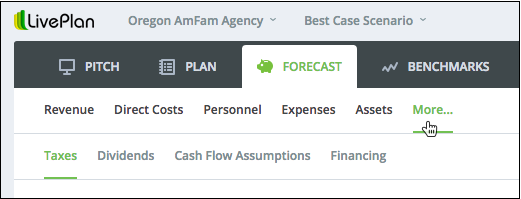 In addition to the new scenarios feature, we made minor changes to how some of the forecast screens are organized in LivePlan. You can now find forecasts for taxes, dividends, cash flow assumptions, and financing in a “more” menu in the Forecast tab. We haven’t taken anything away, just rearranged things a little.