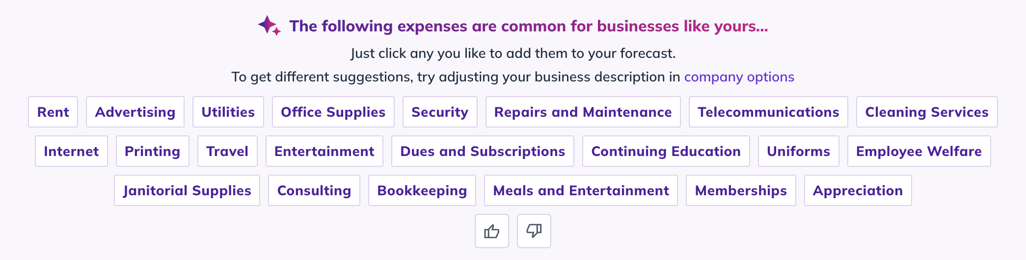 - The LivePlan Assistant will then suggest revenue streams or expense categories based on your description.